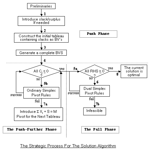 The main idea in this solution algorithm is that the basic variable set (BVS) does not start out complete in the initial tableau, rather variables are brought in based on their contribution to the objective function value.To start the algorithm the LP problem must be converted into the following standard form: