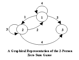 La representación grafica de los juegos podría ser observada como un Torneo que es jugado en una red de conexiones con direcciones. Bajo este esquema, existen dos tipos de nodos: terminales y continuos. Los nodos terminales no llevan a otros nodos, y el jugador I recibe el beneficio asociado a sus propios arcos. Los nodos continuos llevan a por lo menos un nodo adicional. Ambos jugadores seleccionas simultáneamente un nodo respectivo. Para este ejemplo numérico, a continuación se muestra el gráfico correspondiente. En esta red de conexión con direcciones los bordes van desde el vértice u hasta en vértice w, y si algún jugador elige el u mientras el otro elige el w, este último se encuentra en la cabeza del arco conectando dos nodos, por lo tanto recibe en beneficio tuw.