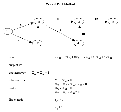 El problema es determinar la mejor manera de cruzar una red para encontrar la forma mas económica posible desde un origen a un destino dado. Suponga que en una red dada existen m nodos y n arcos (bordes) y un costo Cij asociado con cada arco (i a j) en la red. Formalmente, el problema del camino mas corto (CC) es encontrar el camino mas corto (menor costo) desde el nodo de comienzo 1 hasta el nodo final m. El costo del camino es la suma de los costo de cada arco recorrido. Defina las variables binarias Xij, donde Xij =1 si el arco (i a j)es sobre el CC y Xij = 0 de lo contrario. Existen dos nodos especiales llamados origen y destino. El objetivo es encontrar el camino mas corto entre el origen y el destino.El la red siguiente, varios costos son asignados para el camino que va de un nodo a otro. Por ejemplo, el costo de ir desde el nodo 2 al 4 es 6. La función objetivo considera los costos de moverse de un nodo a otro, o de un origen a un destino. Las restricciones están divididas en tres grupos. La restricción del nodo de origen dice que debe dejar el nodo 1 para ir al 2 o 3. La restricción del nodo intermedio dice que si siempre que se dirija a un nodo usted deberá dejar ese nodo. El nodo de destino es similar al nodo de origen dado que se puede alcanzar este nodo solo desde los nodos vecinos.