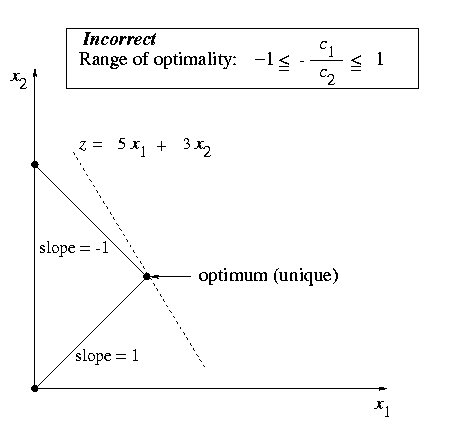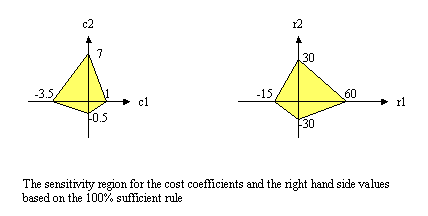 c1/(-3.5) + c2/7 £ 1, -3.5 £ c1 £ 0, 0 £ c2£ 7. Where 3.5 and 7 are the allowable decrease and increase for the cost coefficient C1 and C2, respectively, that we found earlier by the application of the ordinary sensitivity analysis.