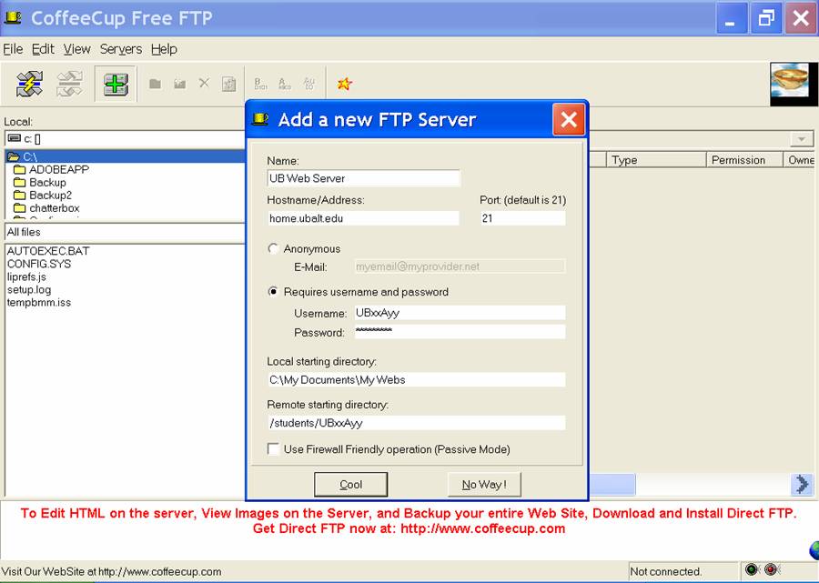 Click on the first icon “connect” on the menu bar and choose the FTP server you want to connect to (in this case the UB Web Server). Click on “Cool” and now you will be taken directly to your “UBxxAyy” folder under “students” directory. Note: Make sure you are connected to the internet before you proceed to Step3!