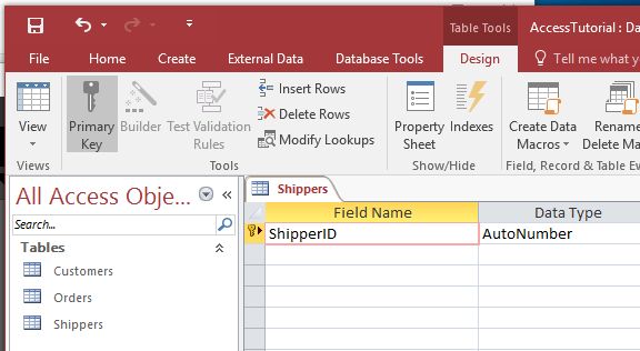Now click to change to the table design view. You will see Access wants you to have a primary key field, so by default it gives you the field "ID" with the type autonumber, and the little primary icon is present. Just to make things very clear, we are going to rename ID and call it ShipperID. Click on the field and edit the name. You can leave the datatype as autonumber.