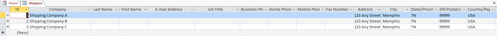 We now have a table that has all of the fields defined, but its empty, waiting for data. You can type this in now (I chose Shippers because it only has 3 records). Note that the Northwind creators were fairly slack by the time they got to this table, so most of the fields are empty and all 3 shippers seem to have the same address.... If this was a production system, those would be red flags for bad data.